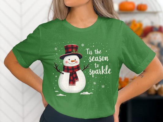 Christmas Snowman Graphic Shirt Women Buffalo Plaid Xmas T-Shirts Tis The Season to Sparkle Holiday Tee Tops