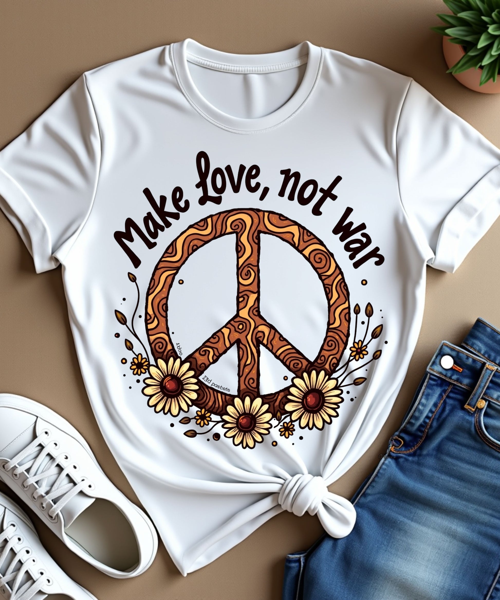 Embrace vintage vibes with this 70s-inspired "Make Love, Not War" design featuring a groovy peace symbol, psychedelic patterns, and floral elements. Perfect for spreading a message of love, peace, and harmony with a nostalgic, retro aesthetic.