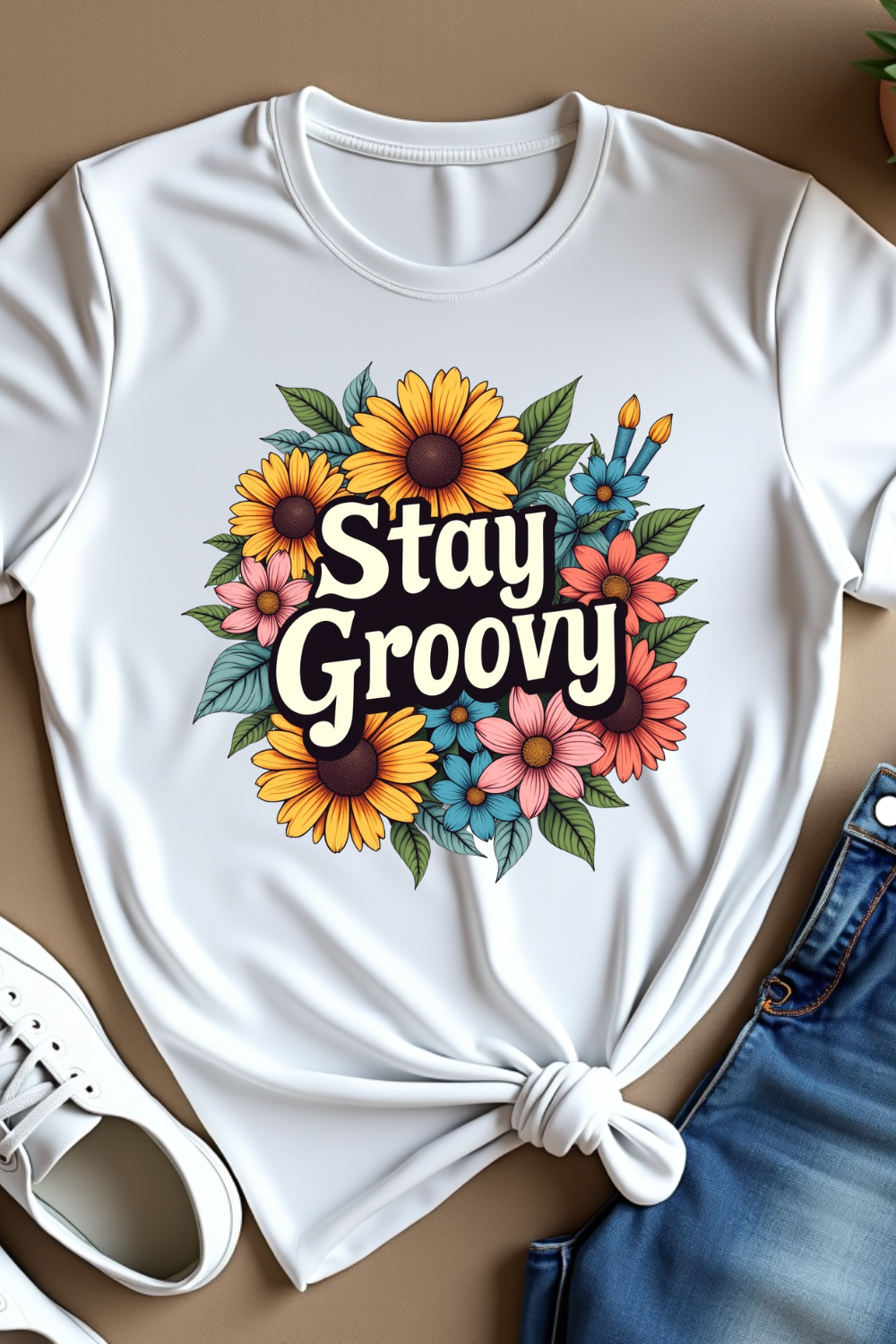Stay Groovy Retro T-Shirt Design – 70s Hippie Graphic with Flowers & Peace Signs"